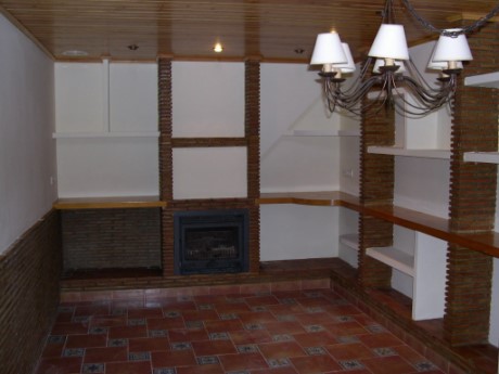 The house has living room on two floors, the second has a fireplace and numerous shelves.